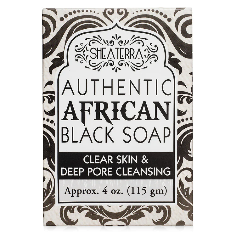 يدمج Shea Terra Organics رماد الصابون الأسود في زيوت الشفاء ويعالجه في ألواح صلبة من الصابون. نظرا للطريقة التي يصنع بها الصابون الأسود، فإن الصابون نفسه كاشط قليلا مما يجعل فرك الجسم ممتازا. يعمل الصابون بشكل رائع على حب الشباب في الظهر والكتف.
