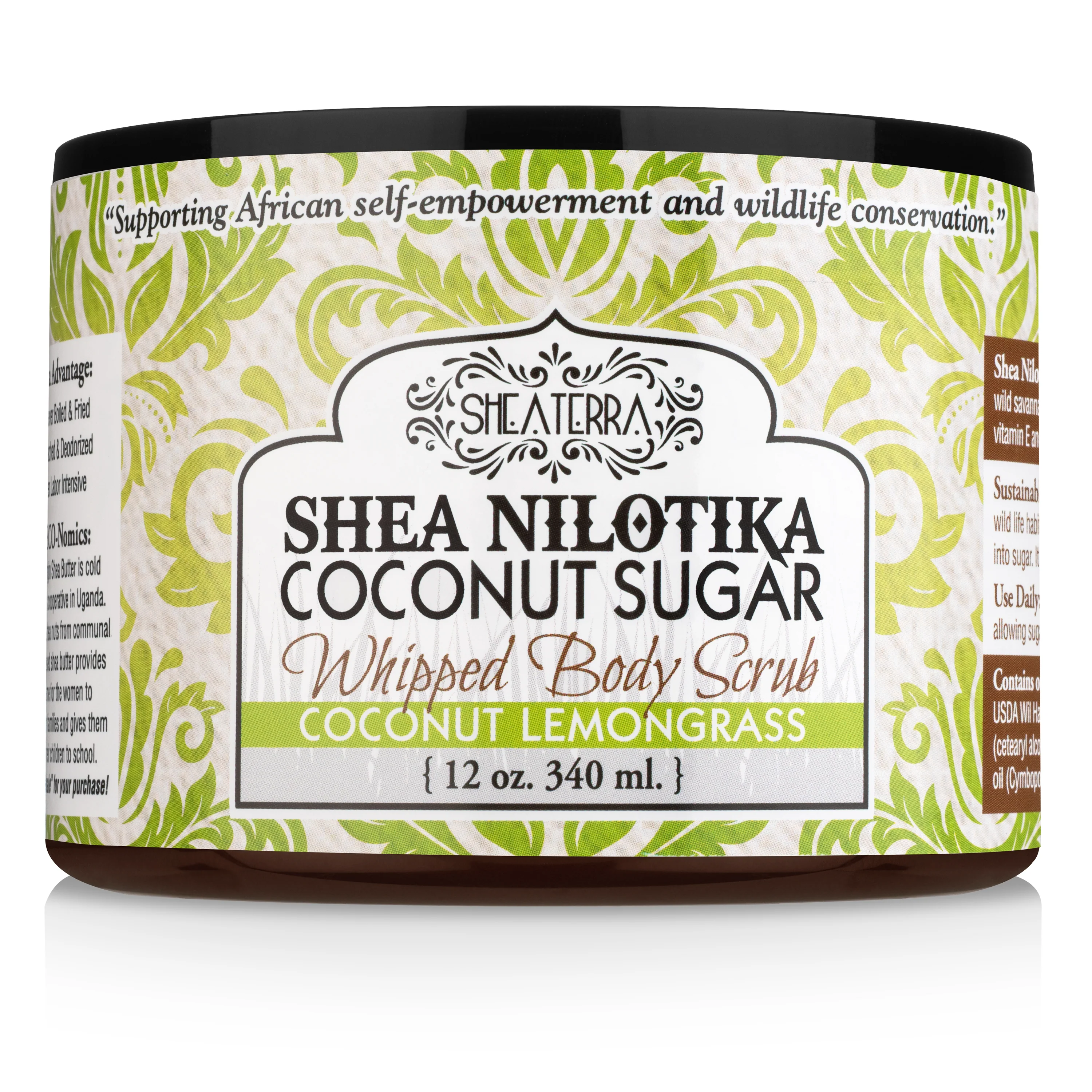 على عكس المقشرات التي تغسل في المجاري وتخلف وراءها فوضى دهنية، يلتصق مقشر جوز الهند والسكر المخفوق من Shea Nilotik بالجلد طوال عملية التقشير. تستخدم Shea Terra بلورات من رحيق أزهار جوز الهند لتزويد البشرة بمصدر غني بحمض الجليكوليك والتقشير. زبدة الشيا النادرة من Shea Nilotik' المعصورة على البارد من أوغندا غنية بفيتامين E والستيرولات النباتية.