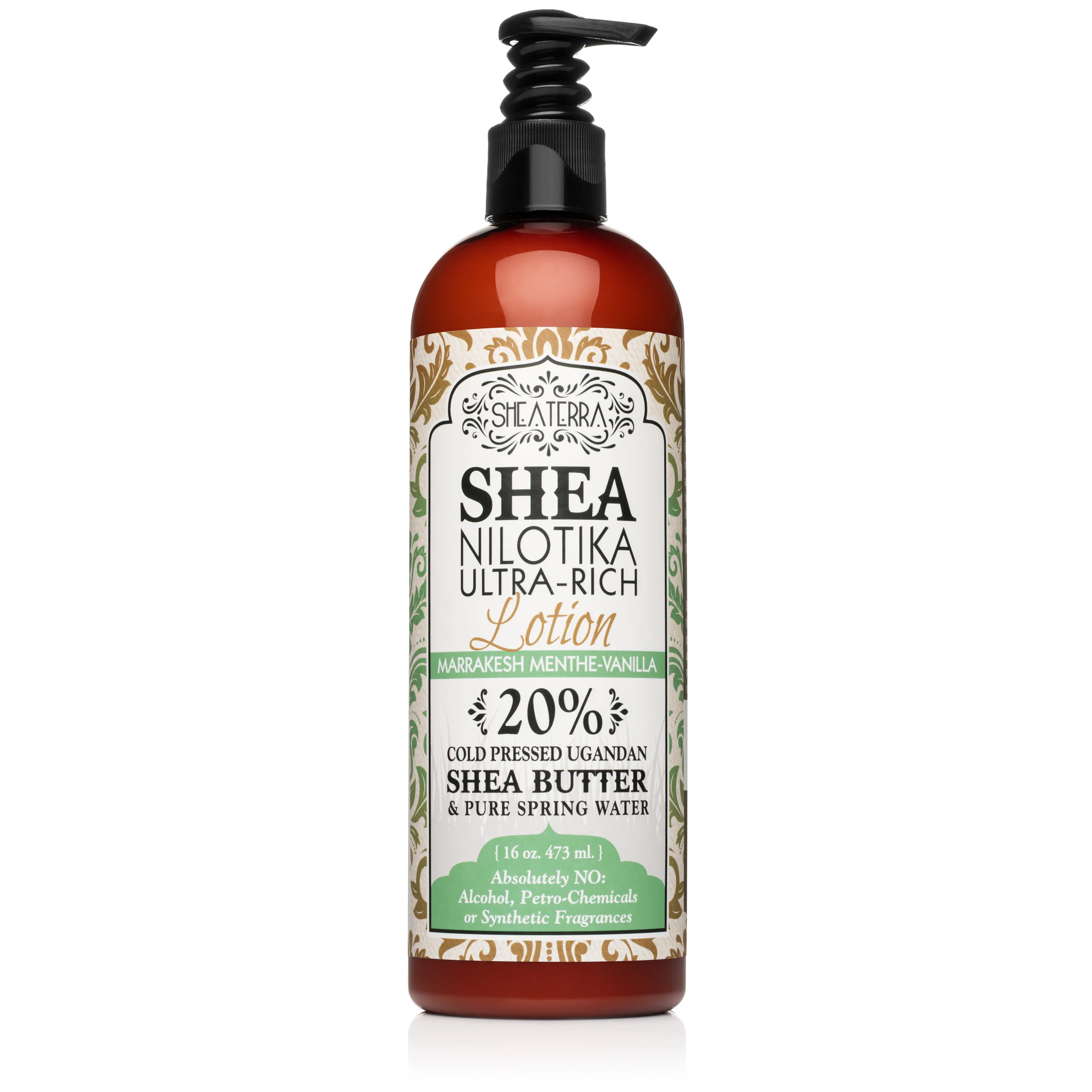 طبيعي للغاية. يتم تشغيل لوشن الجسم Shea Nilotik' Butter Ultra Rich بواسطة زبدة الشيا الشيا Nilotik العضوية المعتمدة بنسبة 20٪ جنبا إلى جنب مع مياه الينابيع الجبلية النقية المرطبة. زبدة الشيا الشيا نيلوتيك تزيل قشرة البشرة وجفافها طوال اليوم. لوشن الجسم Shea Nilotik' Shea Butter Ultra Rich يدلل البشرة مما يخلق لمسة نهائية ناعمة حريرية. يتم تقليل الخشونة والتهيج. معطر بالفانيليا النقي وزيت النعناع المغربي. .